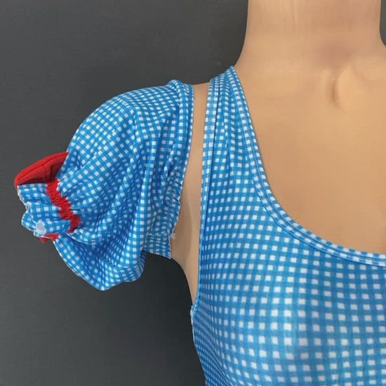 Blue and white gingham bodysuit with garter strap that have little red bows, a matching red sparkle belt, arm puffs, and red mesh gloves. 80% Nylon/20% Spandex